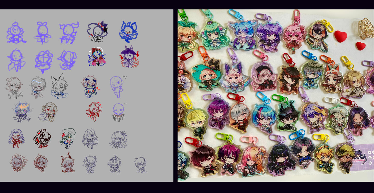 Acrylic Keychains / Prints / Stickers / Photocards / Coin PursesComing 2024: 3D Lenticular Prints/ photocard albums & acrylic deco frames / Enamel Pins / apparel/ Tote Bags / and more!